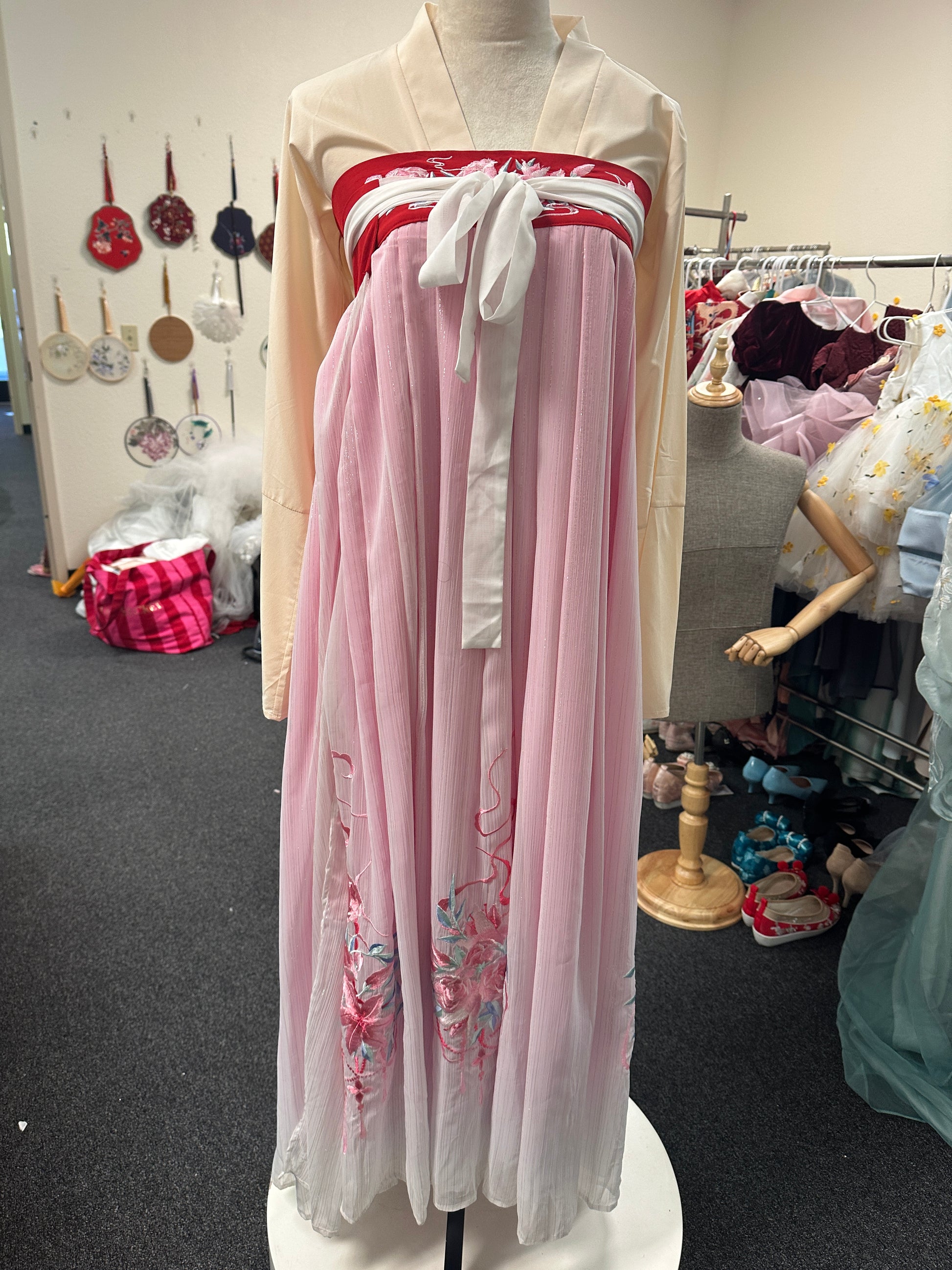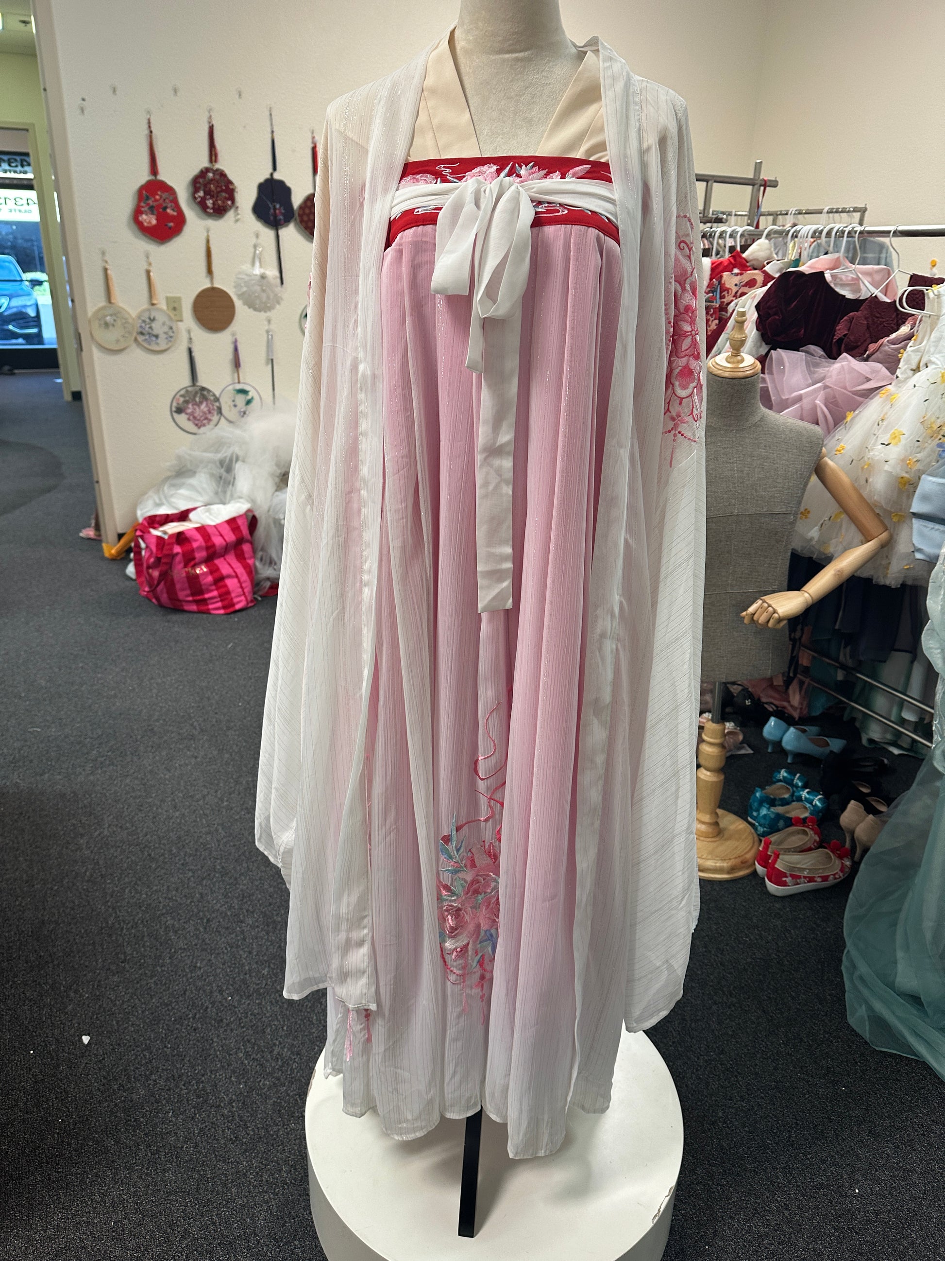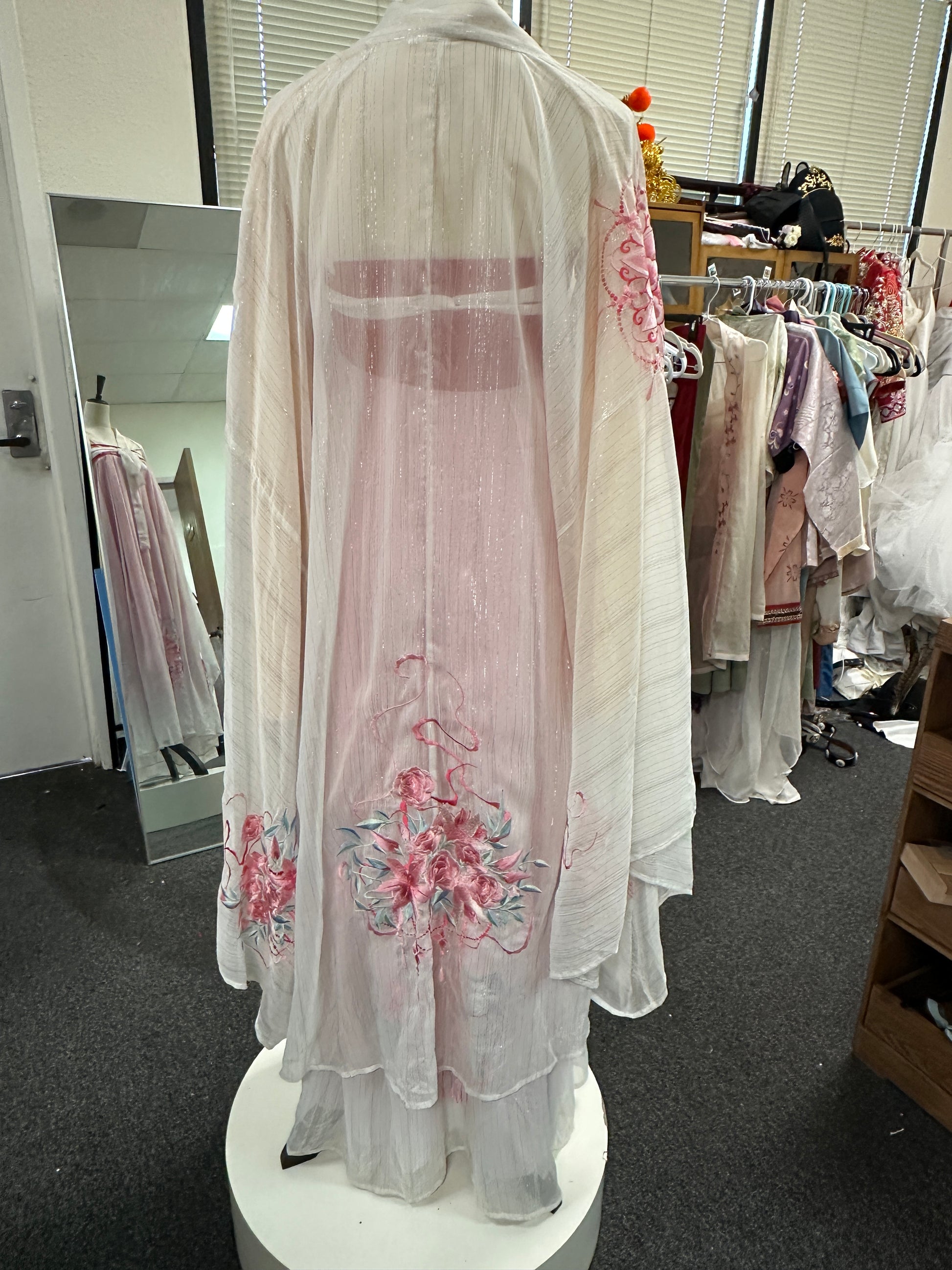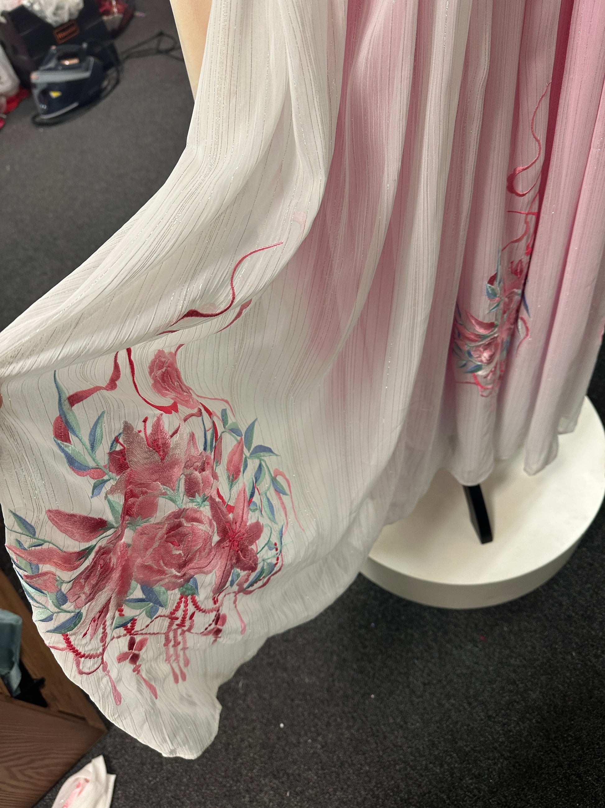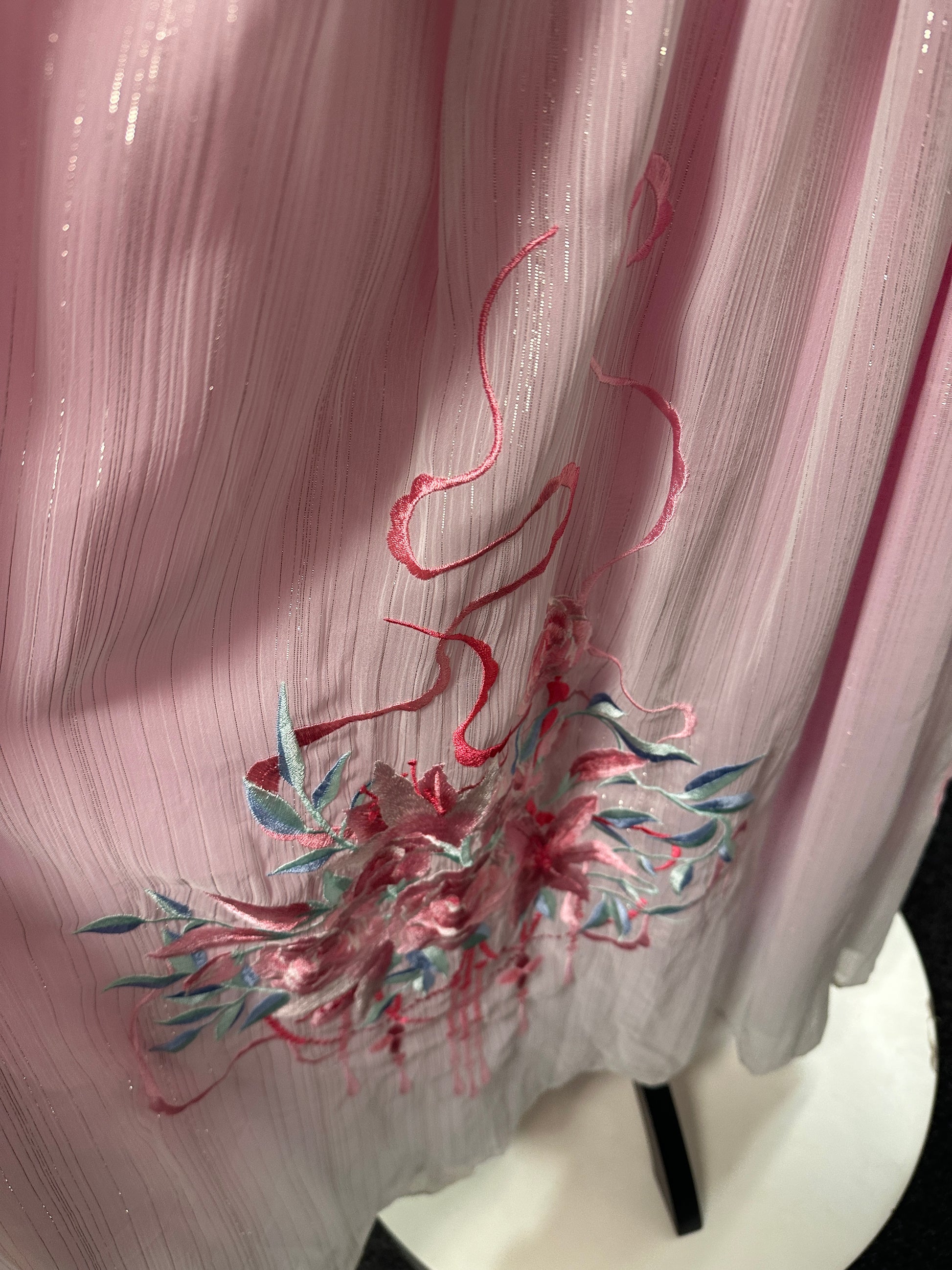 这套汉服名为“醉花阴”,采用唐制齐胸群设计,裙子呈渐变粉色,绣花精致细腻,展现出温柔与浪漫。银丝布面料使裙子更加飘逸,光泽感十足,随风摇曳生姿。整体造型既优雅又轻盈,完美展现了传统与现代气息的结合,适合春秋季节穿着,带来如花般醉人的美感