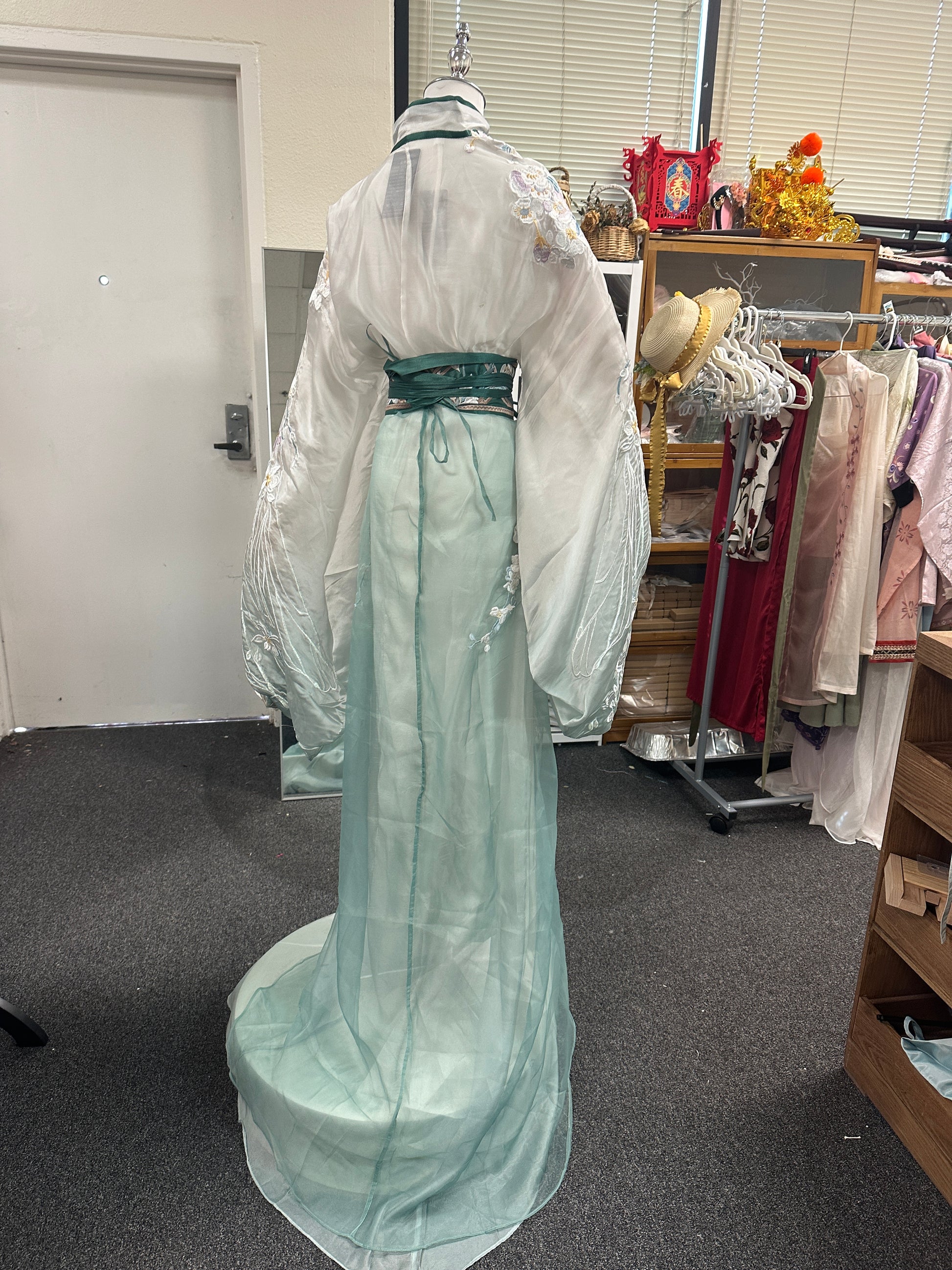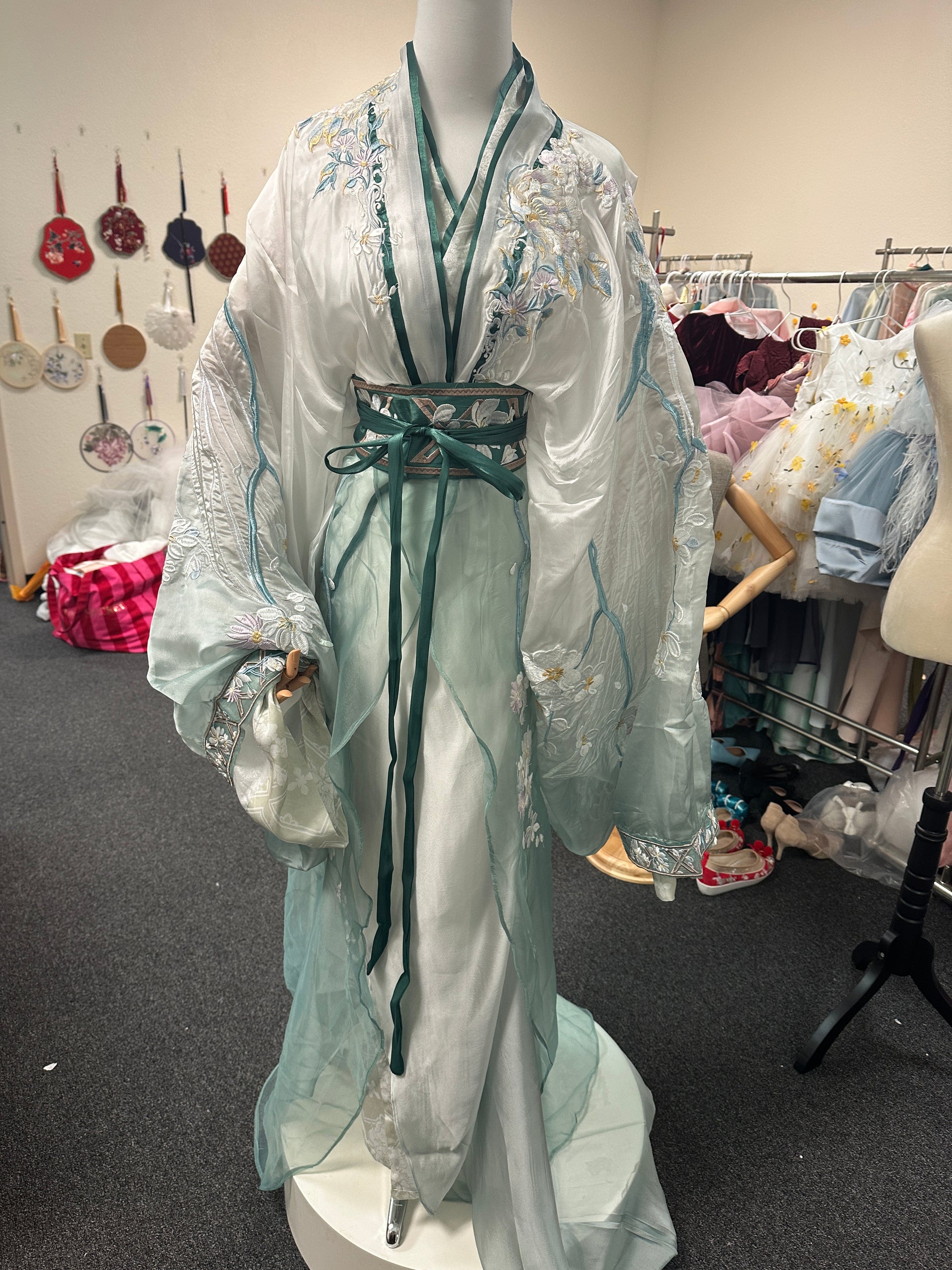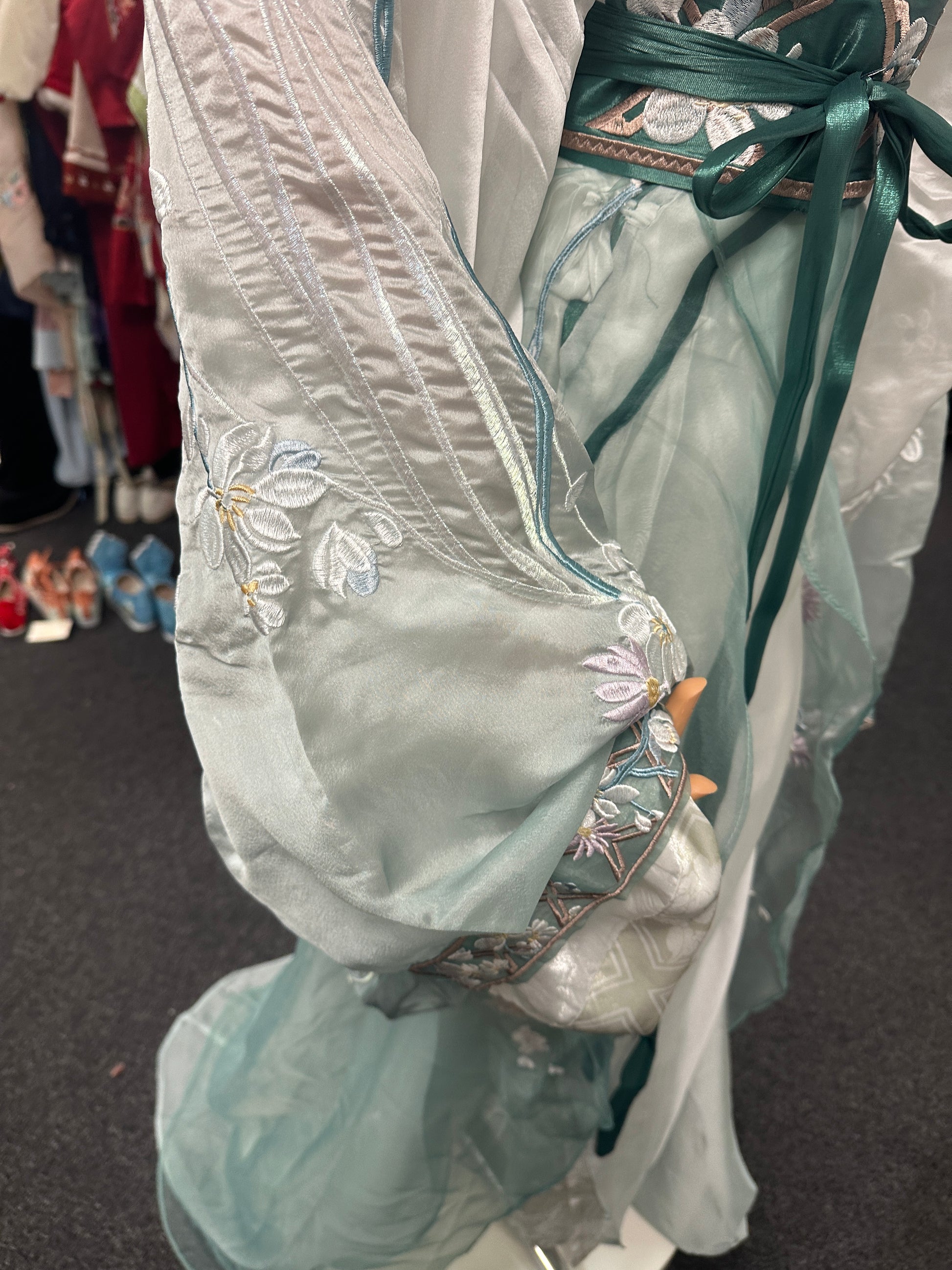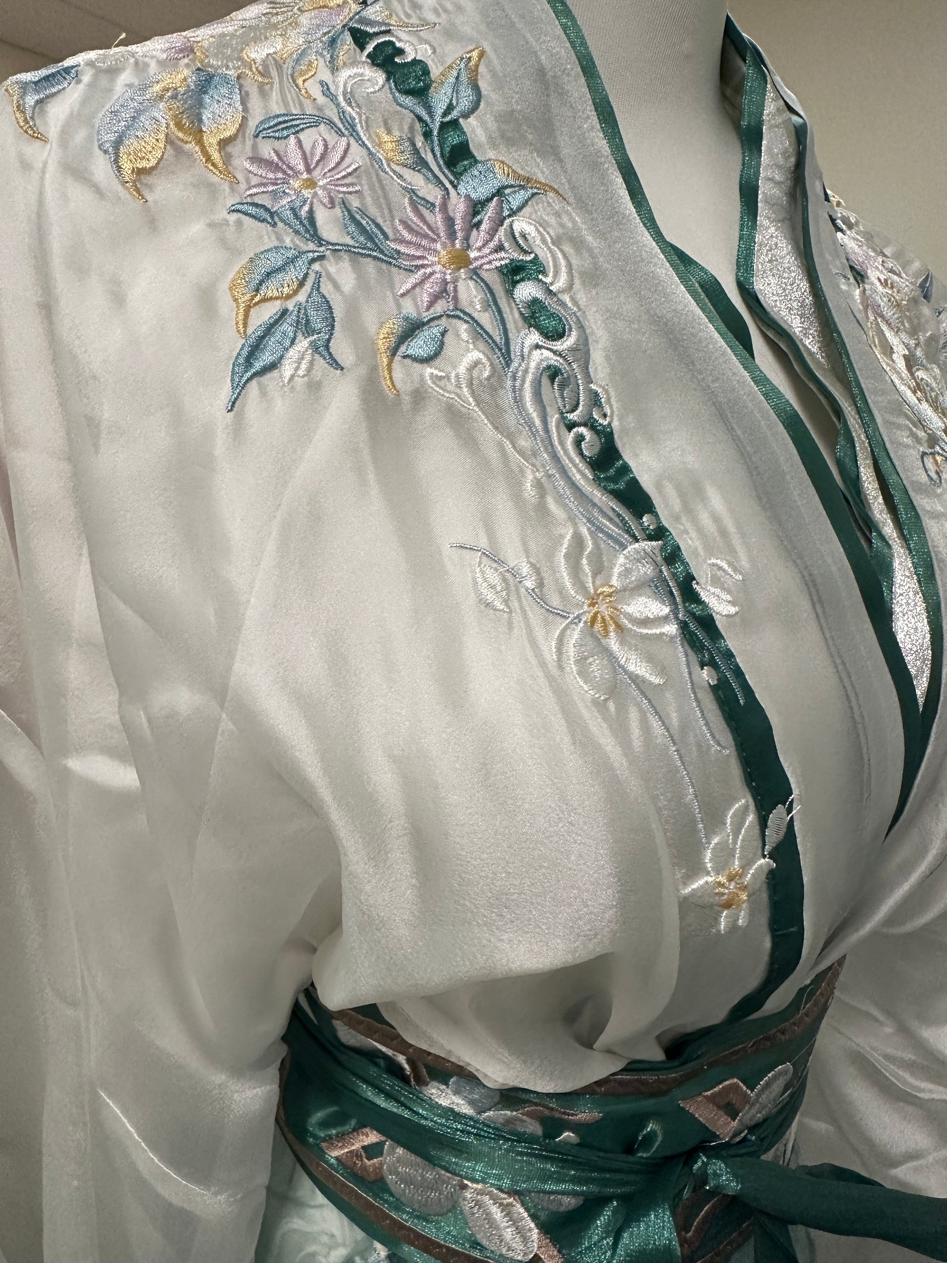 This Hanfu, named Dreaming of Flowers, features a Warring States-style robe with a deep-to-light green gradient, resembling the graceful flow of river water. The exquisite embroidery, delicate and intricate, captures the vitality and softness of spring. The lightweight fabric makes it perfect for spring wear, and the overall design is fresh and layered, evoking a dreamy sense of tranquility and nature.