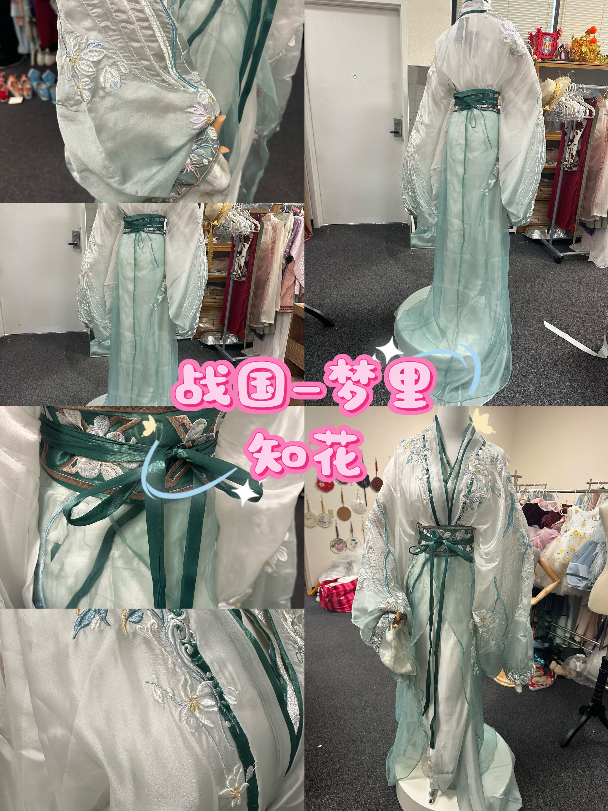 这套汉服名为“梦里知花”,采用战国袍设计,裙子呈深浅渐变绿色,如同江水般流动优雅。绣花精致,细腻的刺绣展现了春天的生机与柔美。面料轻盈舒适,适合春季穿着,整体造型既清新又富有层次感,仿佛带着一份梦幻般的宁静与自然。